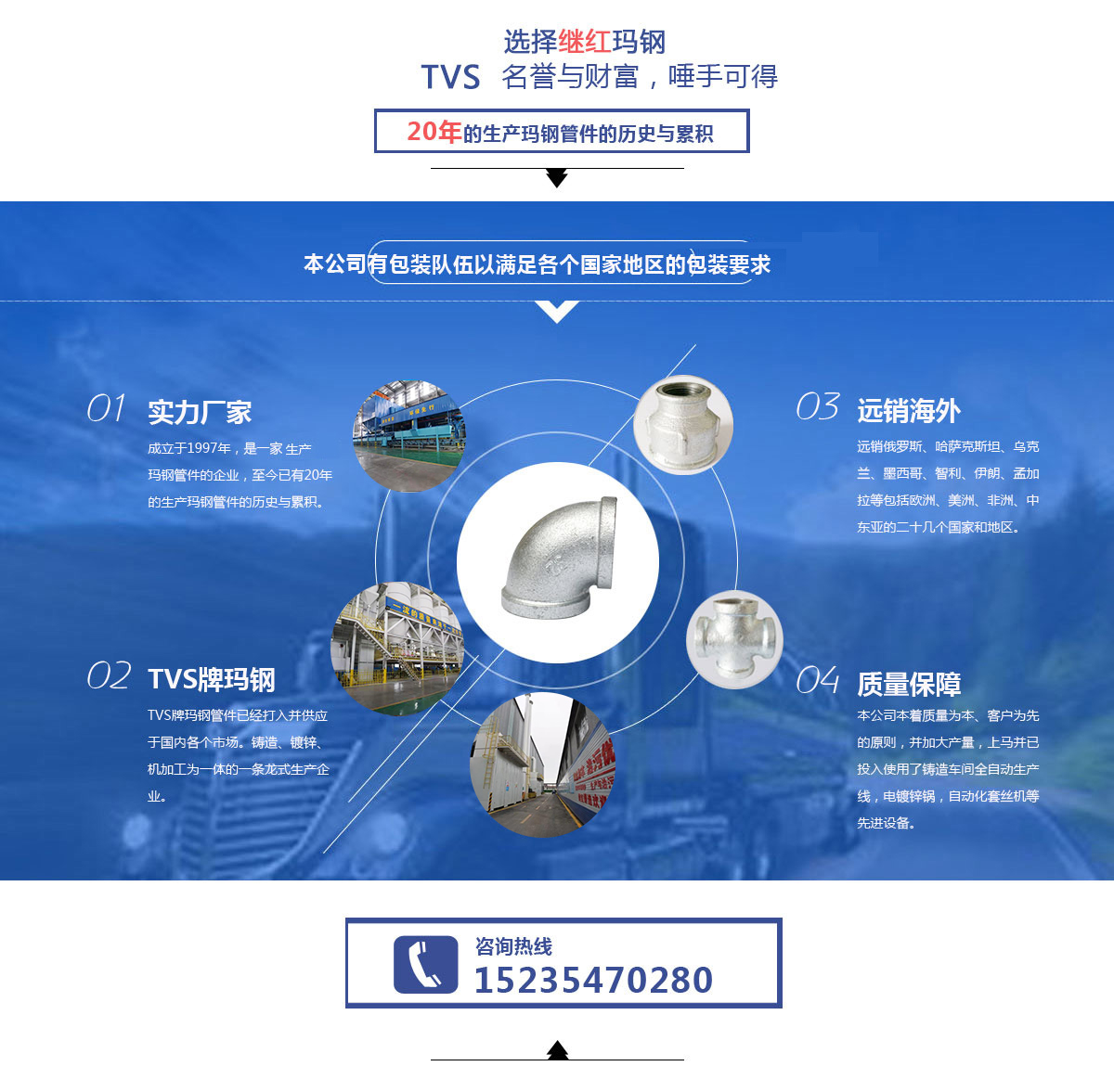 近幾年來(lái),本公司亦開(kāi)始涉足國(guó)內(nèi)瑪鋼管件的生產(chǎn)和銷(xiāo)售。TVS牌瑪鋼管件已經(jīng)打入并供應(yīng)于國(guó)內(nèi)各個(gè)市場(chǎng)。