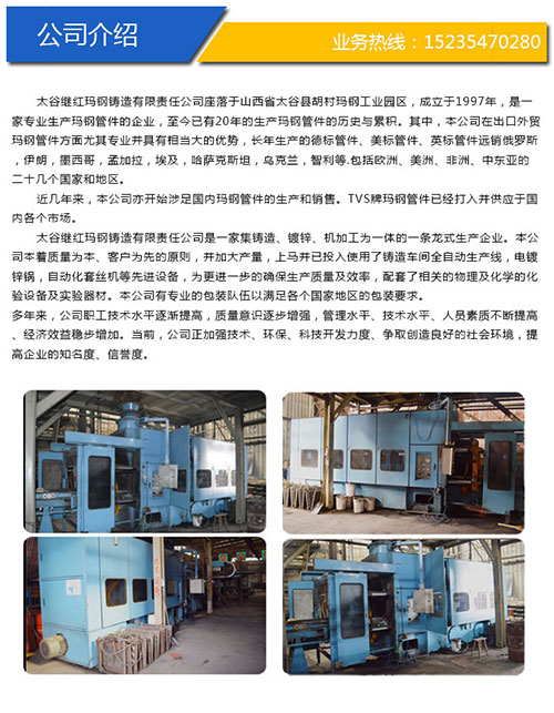 太谷繼紅瑪鋼鑄造有限公司是一家專業(yè)生產瑪鋼管件的企業(yè),至今已有20年的生產瑪鋼管件的歷史與累積。本公司在出口外貿瑪鋼管件方面尤其專業(yè)并具有相當大的優(yōu)勢,長年生產的德標管件、美標管件英標管件遠銷俄羅斯,伊朗,墨西哥,孟加拉,埃及,哈薩克斯坦,烏克蘭,智利等.包括歐洲、美洲、非洲、中東亞的二十幾個國家和地區(qū)。